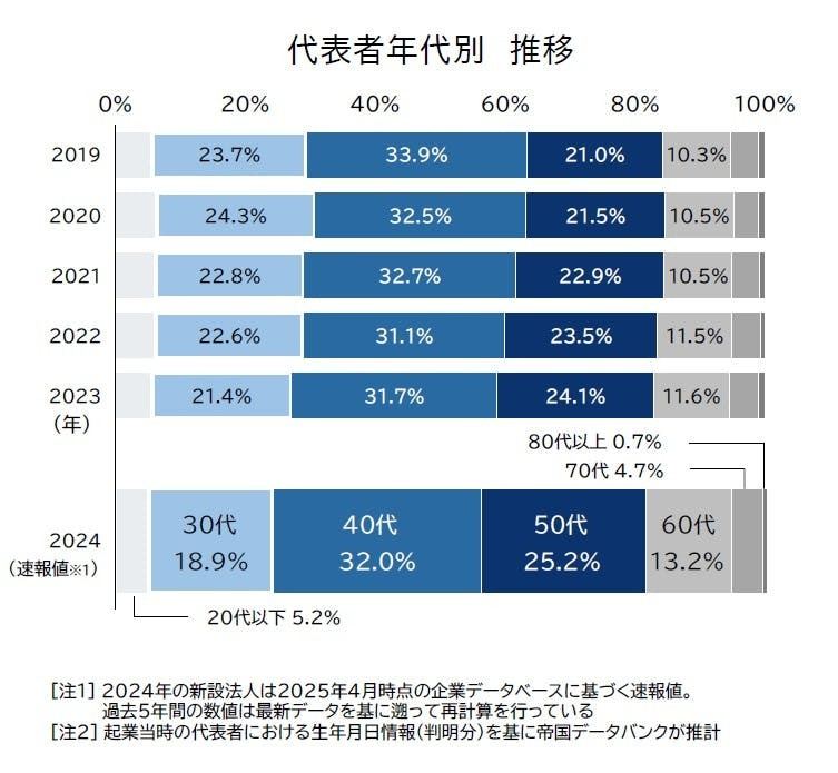 年代別で最も多いのは「40代(32.0%)」で、2年連続で割合が上昇している。一方で、コロナ禍前には4社に1社を占めていた「30代(18.9%)」は、2000年以降で初めて20%を下回ったことがわかった。また「20代以下(5.2%)」も2016年以来8年ぶりの低水準となり、若年層・現役世代の起業は縮小傾向での推移となったようだ。逆に上昇傾向での推移をみせているのが、シニア層・早期リタイア層だ。「50代(25.2%)」は20年ぶりの高水準となったほか「60代」「70代」は共に2000年以降で最高を更新した。