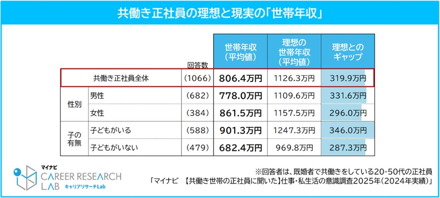 本調査では共働き正社員全体の平均世帯年収は806.4万円、理想の世帯年収は1126.3万円であり、理想とのギャップは319.9万円であったことが報告された。子の有無別では、子どもがいない夫婦よりもいる夫婦の方が平均世帯年収、理想の平均世帯年収ともに高い傾向がみられたという。