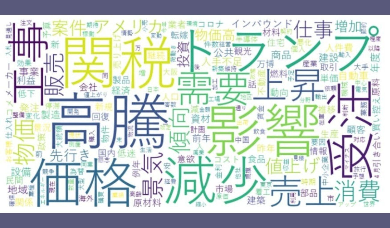 TDBはコメントの内容についても分析しており「高騰」「価格」「関税」「トランプ」などのワードが頻出したとして、トランプ関税に対する警戒感や不透明感が急速に高まっているとの見解を示している。キーワードの出現状況から分析すると、どちらかといえば後ろ向きな単語が目立つという。