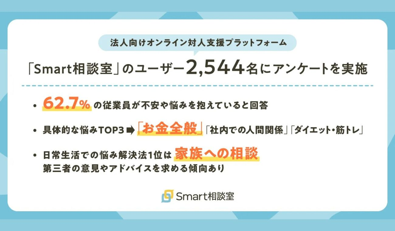 株式会社Smart相談室(本社:東京都港区、代表取締役・CEO:藤田康男)は、法人向けオンライン対人支援プラットフォーム「Smart相談室(スマートそうだんしつ)」を利用できるユーザーを対象に、日常でのモヤモヤや悩みに関する調査を実施し、分析レポートを公開した。