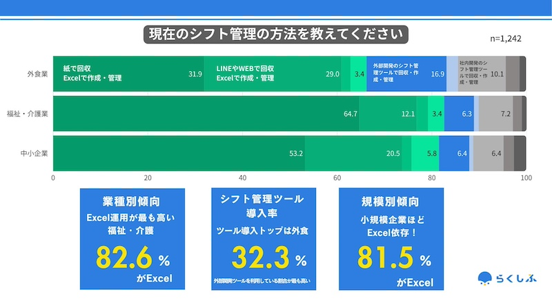業種別では、外食業のツール導入率が約32%と比較的高いものの、それでも3社に2社はExcel主体での運用だという。福祉・介護業界ではExcelの利用率は82.6%と、今回の調査内では際立って高く、シフト管理ツールの導入率も16.4%で、IT化の遅れが顕著であった。
