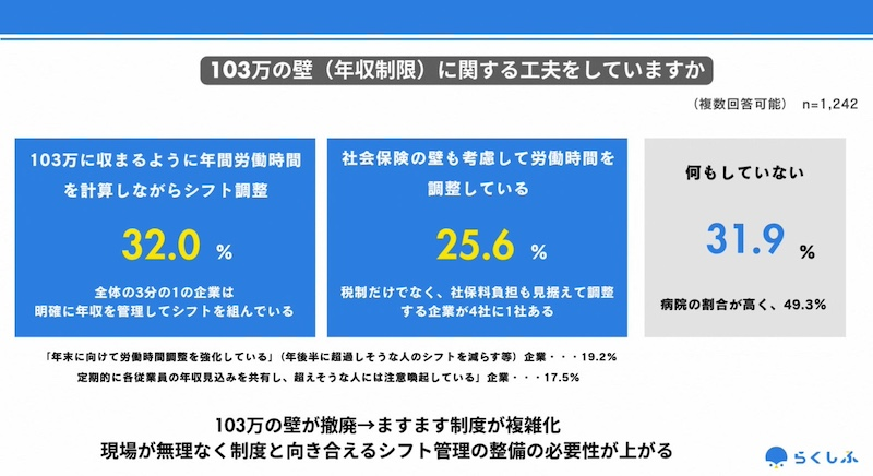 今回の調査では、パート・アルバイトの年収制限、いわゆる「103万円の壁」に関するシフト管理上の工夫についても質問。その結果、全体の68.1%が“何らかの配慮をしている”と回答したことがわかった。中でも「103万円以内に収まるようシフトを調整している(32.0%)」「130万円の壁も考慮している(25.6%)」など、制度を意識した調整は既に多くの職場で実施されていることが判明している。