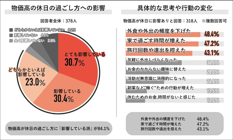 本調査ではまずはじめに、回答者全体の378人に物価高が及ぼす休日の過ごし方への影響について質問。その結果「影響している派(「とても影響している:30.7%」「影響している:30.4%」「どちらかといえば影響している:23.0%」)」が合わせて84.1%と大多数を占めることが明らかになった。