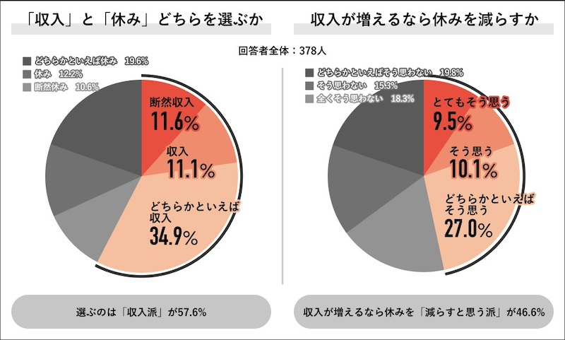 続いて「収入」と「休み」のどちらを選ぶか尋ねる項目では「収入派(「断然収入:11.6%」「収入:11.1%」「どちらかといえば収入:34.9%」)」が57.6%で半数を超えたという。また、収入が増えるなら休みを減らすかとの問いには「そう思う派(「とてもそう思う:9.5%」「そう思う:10.1%」「どちらかといえばそう思う:27.0%」)」が46.6%との回答が寄せられている。