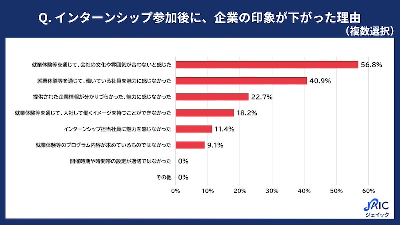 さらに本調査では「ある」と回答した人を対象に「印象が下がった理由について、当てはまるものすべてを選択してください」と質問。その結果、上位には「就業体験等を通じて、会社の文化や雰囲気が合わないと感じた(56.8%)」「就業体験等を通じて、働いている社員を魅力に感じなかった(40.9%)」が挙げられたという。
