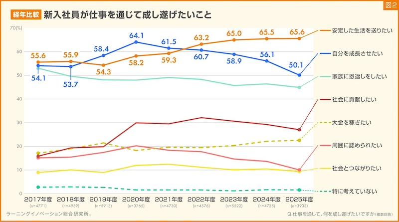 同社は新入社員が仕事を通じて成し遂げたいことについて、2017年度から9年間、各年度の新入社員に質問をした結果を比較。「安定した生活を送りたい」と回答した新入社員の割合は、2019年度の54.3%を境に年々増加傾向にあり、2025年度は65.6%と過去最高の割合になったと報告した。一方で「自分を成長させたい」と回答した新入社員の割合は、2020年度の64.1%を境に減少傾向にあり、2025年度は過去最低の50.1%になったという。