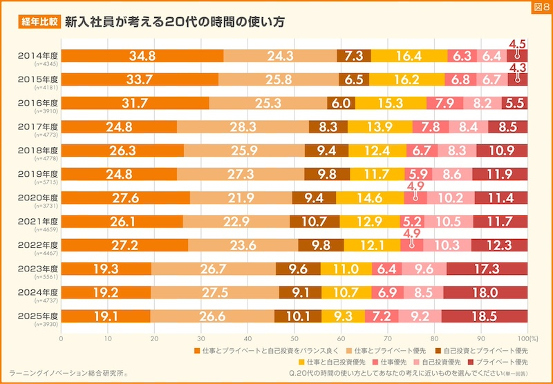 「プライベート優先」と回答した新入社員の割合は、2014年度の4.5%から徐々に増加しており、2025年度は4倍以上の回答割合を示している。また「仕事とプライベートと自己投資をバランスよく」「仕事と自己投資優先」と回答した人の割合は、2014年度から2025年度にかけて半数近く減少したことがわかった。