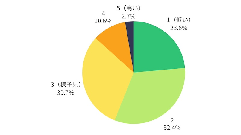 本調査では「あなたは新卒で入社した会社を、3年以内に転職する可能性があると思いますか?ご自身の考えに最も近いものを5段階評価(1が低い、5が高い)でお選びください。」という設問に対し、下記の回答割合が示された。