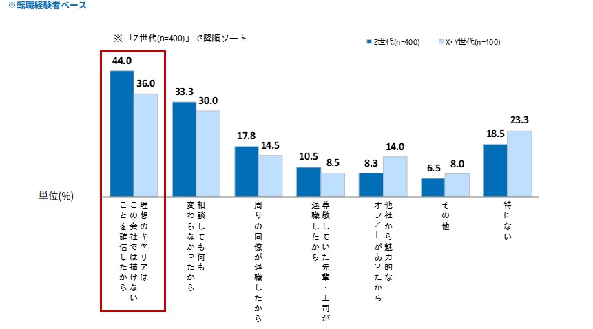 また、Z世代の約44.0%が転職を決断した主な理由として「理想のキャリアはこの会社では描けないことを確信したから」を挙げたことも明らかになった。X・Y世代(36.0%)と比較して高い割合を示しており、Z世代が将来のキャリア展望を重視していることがわかる。