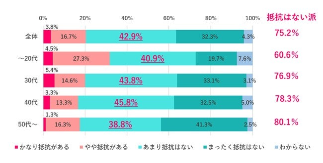 なお、年代別での比較結果を見ると、若年層の方が抵抗を感じる割合が高く、年代が上がるにつれ「抵抗はない派」の割合が増加する傾向があることがわかる。