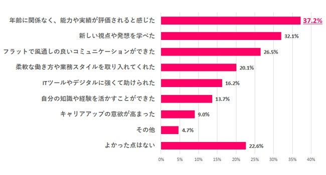 年下の上司と働いてよかった点としては「年齢に関係なく、能力や実績が評価されると感じた(37.2%)」「新しい視点や発想を学べた(32.1%)」「フラットで風通しの良いコミュニケーションができた(26.5%)」が多く挙げられたという。