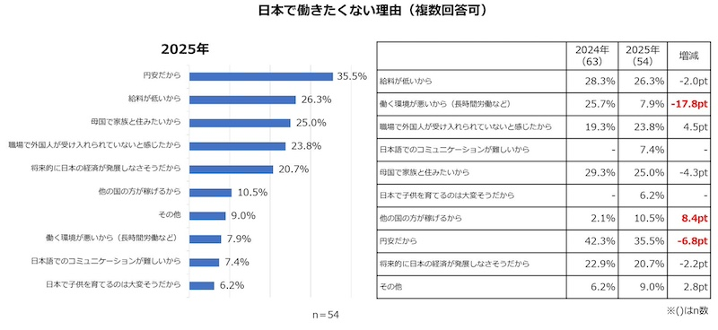 一方で、日本で働きたくない理由については「円安だから(35.5%)」「給料が低いから(26.3%)」「母国で家族と住みたいから(25.0%)」が多いようだ。日本の経済状況や収入面への不満を感じている割合が多いことがわかる。なお、2024年と比較すると「他の国の方が稼げるから」が8.4pt増加した一方で 「働く環境が悪いから(長時間労働など)」は17.8pt減少「円安だから」は6.8pt減少したという。