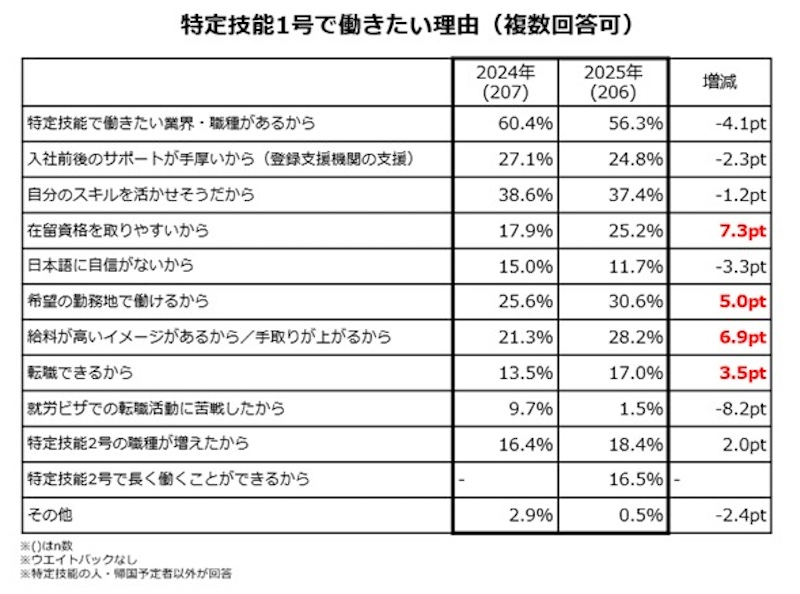特定技能1号で働きたい理由のうち増加傾向がみられたのは「在留資格を取りやすいから(+7.3pt)」「給料が高いイメージがあるから/手取りが上がるから(+6.9pt)」「希望の勤務地で働けるから(+5.0pt)」「転職できるから(+3.5pt)」などであった。