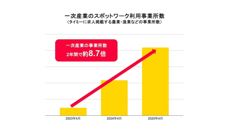 タイミーに求人掲載する一次産業の事業所数が2年間で約8.7倍に