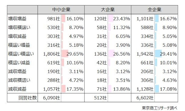 各回答について集計した結果「増収増益」「増収横ばい」「増収減益」を合わせると「増収」は30.6%(同39.9%)で「売上横這い」は44.5%(同33.1%)「減収」は24.8%(同26.9%)となっている。また「増益(増収増益+横這い増益+減収増益)」は24.8%(同32.7%)で「利益横這い」は42.9%(同34.9%)「減益」は32.1%(同32.3%)と報告された。前回調査との比較を見ると、売上・利益ともに苦戦する企業が目立っている。