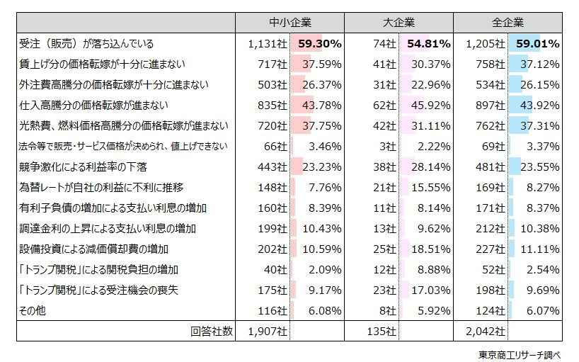 「減益」と回答した企業からは「受注(販売)が落ち込んでいる(59.0%)」「仕入高騰分の価格転嫁が進まない(43.9%)」「光熱費、燃料価格高騰分の価格転嫁が進まない(37.3%)」「賃上げ分の価格転嫁が十分に進まない(37.1%)」との理由が多く寄せられており、価格転嫁に関する回答が目立つ結果となった。