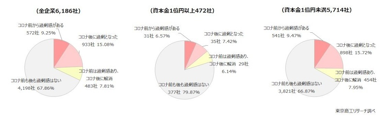規模別の分析では、大企業の「過剰感あり」は13.9%だったのに対し、中小企業では25.1%と、10ポイント以上の開きが生じていることもわかった。