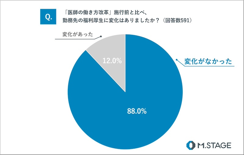 本調査では、勤務先の福利厚生について働き方改革施行前と比べ「変化がなかった(88.0%)」と回答する医師が約9割に及んでいる。「変化があった(12.0%)」は約1割にとどまり、働き方改革の福利厚生への影響は大きくないことが明らかになった。