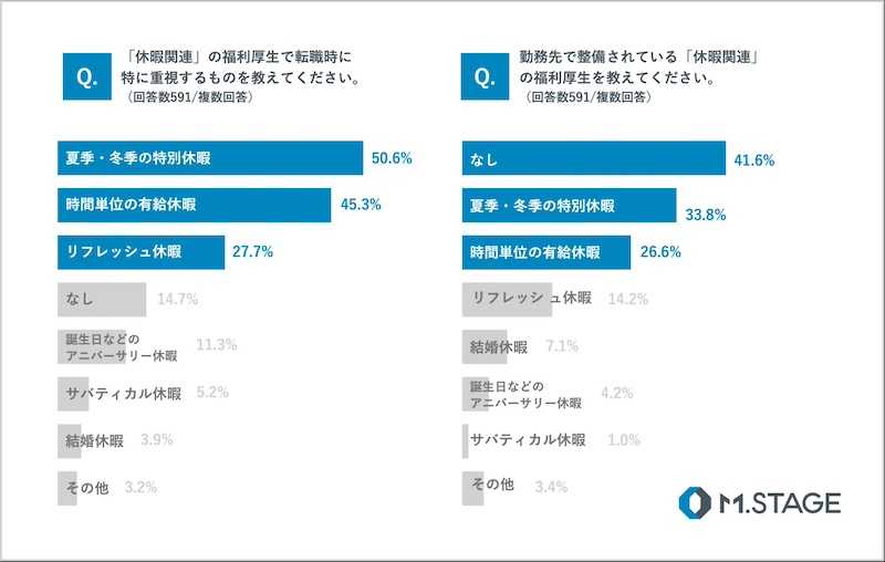 一方で「休暇関連」「職場環境・業務関連」については現在の勤務先での福利厚生に「なし」と回答する人がいずれも4割を超えており、ニーズと実態のギャップが明らかになった。