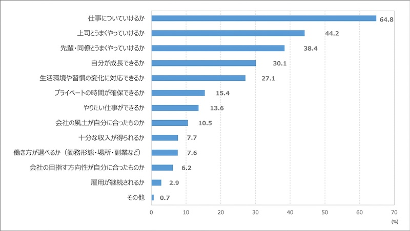 続いて本調査では、仕事・職場生活をするうえでの不安について質問。その結果「仕事についていけるか(64.8%)」がトップに挙げられたという。なお、昨年と比べて割合が増加したのは「自分が成長できるか(30.1%)」で、昨年比+4.6ポイントとなり昨年の5位から今年は4位と上昇している。