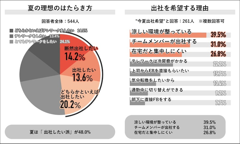 一方で夏の理想のはたらき方としては「出社したい派(48.0%)」と「テレワークをしたい派(52.0%)」とで意見が分かれている。出社を希望する理由としては「涼しい環境が整っている(39.5%)」「チームメンバーが出社する(31.0%)」「在宅だと集中しにくい(26.8%)」などが多いようだ。テレワークを希望する理由としては「外が暑いから(67.8%)」「通勤による疲労軽減(60.4%)」「移動による汗対策が面倒(55.5%)」との回答が上位に挙げられている。
