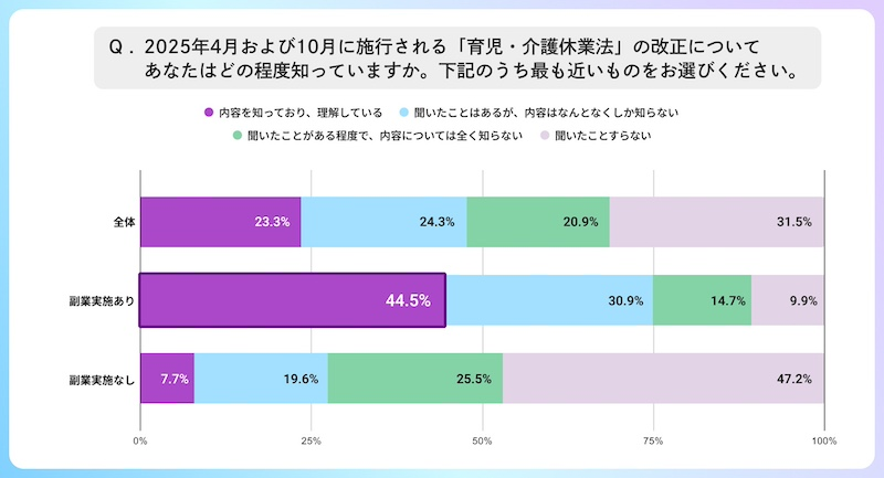 同社は今回、 2025年4月1日より段階的に施行されている「育児・介護休業法」の改正について、認知度を調査。「聞いたことすらない」が最多の31.5%となったことを報告した。また、副業経験者における「育児・介護休業法」の認知度では「内容を知っており、理解している」が44.5%と全体よりも高い結果となったことも明らかになっている。