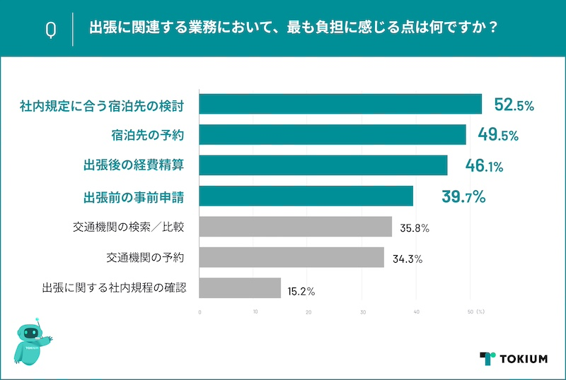 出典元:TOKIUM、出張手配に関する実態調査を実施、最も負担を感じるのは「社内規程に合う宿泊先の検討」(52.5%)(株式会社TOKIUM)