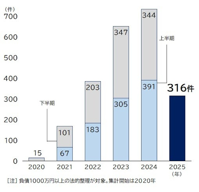 TDBの発表によれば「実質無利子・無担保融資(ゼロゼロ融資)」を受けていたものの倒産した「ゼロゼロ(コロナ)融資後倒産(負債1000万円以上、法的整理)」は、2025年上半期(2025年1-6月)に316件判明している。