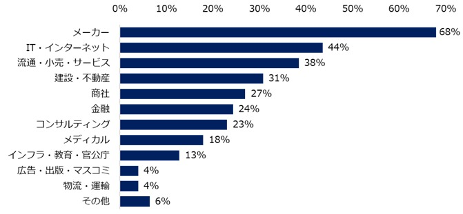 異業種に転職したミドル人材の”出身業種”としては「メーカー(68%)」「IT・インターネット(44%)」が上位に並んでいる。一方で”転職先の業種”としては、上位には「IT・インターネット(62%)」「メーカー(51%)」の2業種が並んだ。