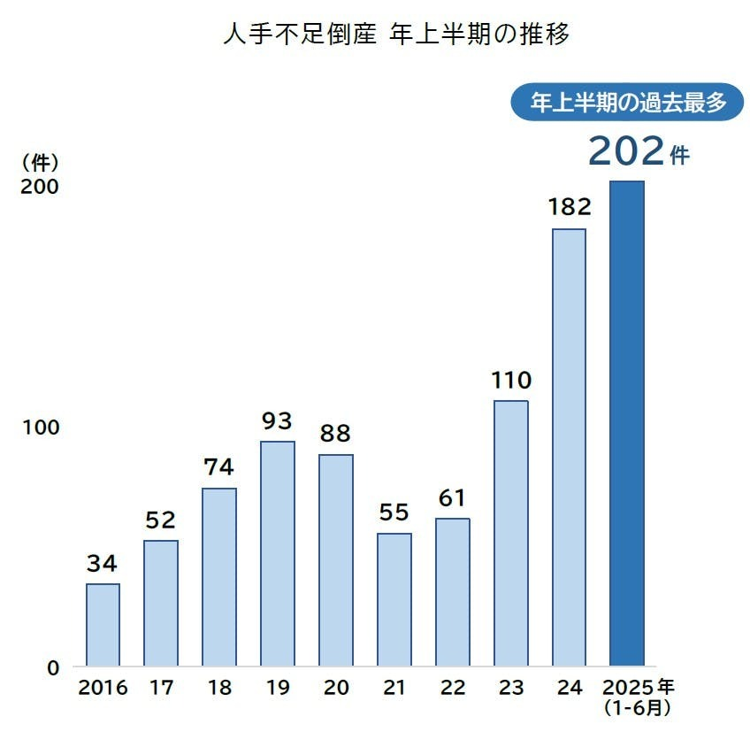株式会社帝国データバンク(以下:TDB)は、従業員の離職や採用難等による人手不足を要因とする「人手不足倒産」の発生状況について調査・分析を実施。2025年上半期(1-6月)の人手不足倒産は202件発生し、上半期としては2年連続で過去最多を更新したことを報告した。