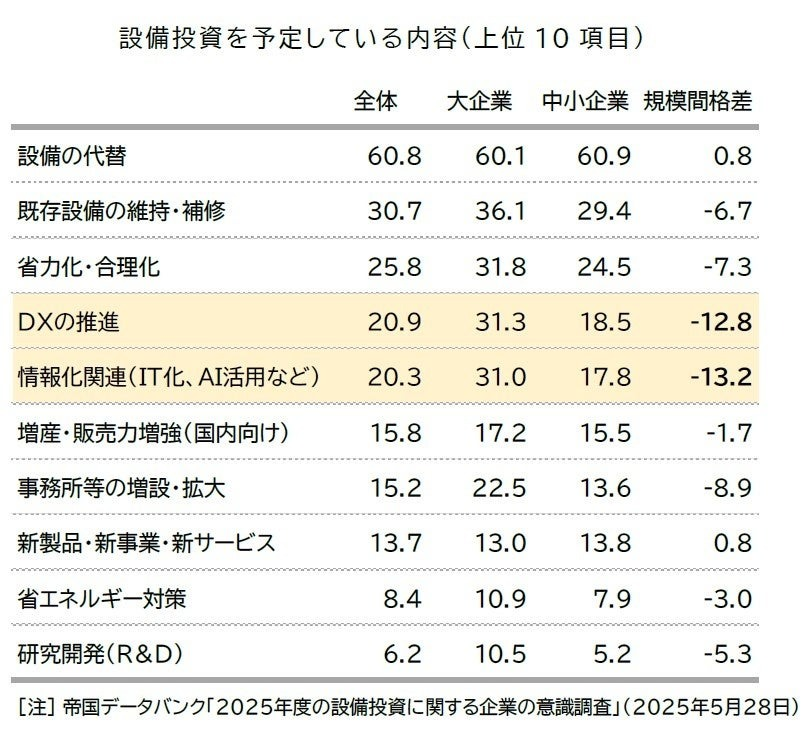 続いてTDBは、人手不足の解消に向けての施策について調査している。TDBは従業員数や労働時間といった「労働投入量の増加」や、効率的なアウトプットによる「生産性の向上」のいずれかが必要となると考察。しかしTDBが実施した『2025年度の設備投資に関する企業の意識調査』では、設備投資を予定している内容において「DXの推進」や「情報化関連(IT化、AI活用など)」といったデジタル投資の面が、大企業に比べて中小企業は10ポイント以上低く、大きな開きが生じている実態が明らかになったという。