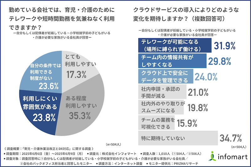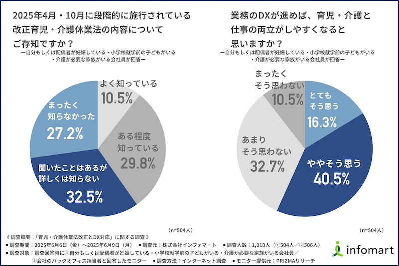 株式会社インフォマート(本社:東京都港区 代表取締役社長:中島健)は、自分もしくは配偶者が妊娠している、小学校就学前の子どもがいる、介護が必要な家族がいる会社員504名と、会社のバックオフィス担当者506名を対象に、育児・介護休業法改正とDX対応に関する調査を実施した。
