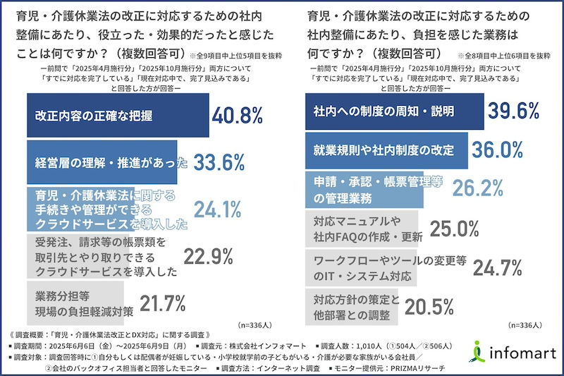 一方で、改正に対応するための社内整備にあたって負担を感じた業務については「社内への制度の周知・説明(39.6%)」「就業規則や社内制度の改定(36.0%)」「申請・承認・帳票管理等の管理業務(26.2%)」などが多いようだ。