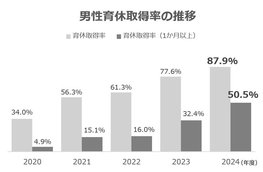 そうした中で、2024年度にはグループ全体で1日以上の取得率84.3%を達成。同社においては、2021年10月から「1カ月以上の取得促進」を打ち出しており、男性社員の実質的な育児参加を目指してきた。その結果、2024年度の時点で2025年度目標である「1カ月以上の取得率」50%の達成が実現したという。