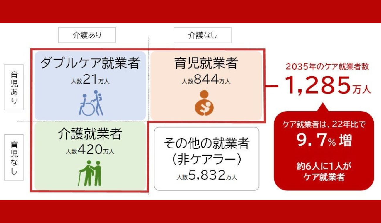 働きながら育児や介護といったケアを行うケア就業者が、今後増加していく見込みであることが判明。2035年に育児・介護の両方でケアを行うダブルケア就業者数については、2022年と比較して30%以上増加する可能性があるという。