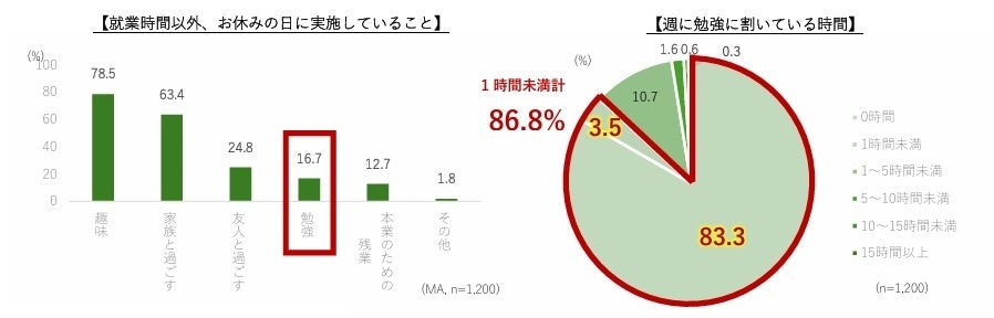 本調査では『あなたの就業時間以外・お休みの日に実施していることを教えてください』という質問に対して「勉強(※本人が「勉強」ととらえているもの)」と答えた人は16.7%と、6人に1人程度の割合であった。