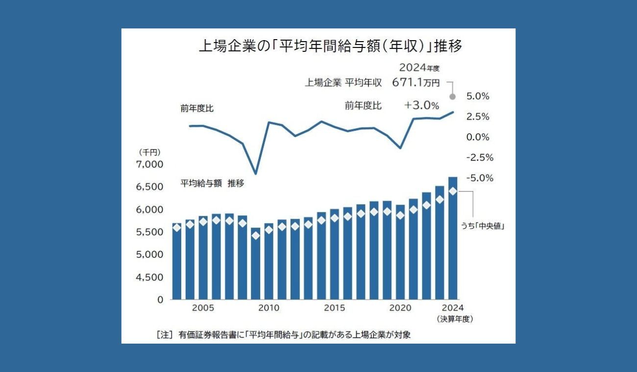 TDBの方向によると、2024年度決算期(2024年4月-25年3月期)の全上場約3800社における平均年間給与(平均年収、提出された有価証券報告書に基づく)は671万1000円となっている。4年連続で前年度を上回り、2023年度の651万4000円に比べて19万7000円・3.0%増であった。TDBは平均給与・前年度からの増加額・伸び率ともに過去20年で最高となったことを報告している。