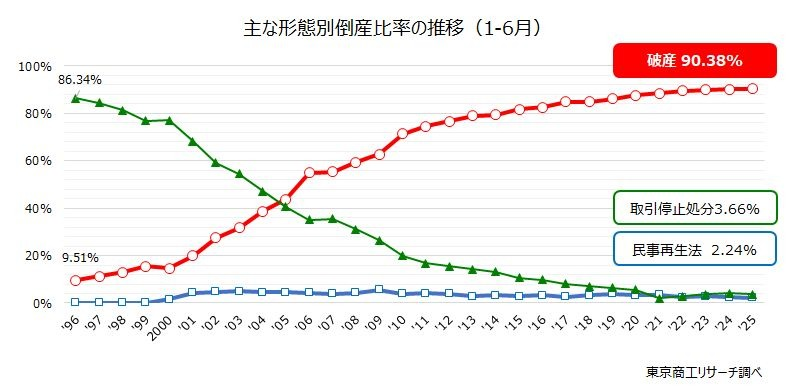 TSRの報告によると、2025年上半期(1-6月)の倒産で、破産の構成比が90.3%に達したことがわかった。TSRは過去を振り返り、2004年上半期までは取引停止処分の構成比が破産を上回っていたと解説。30年前の1996年は上半期の倒産7270件のうち、取引停止処分が6277件と86.3%を占めており、破産は692件と9.5%だった。
