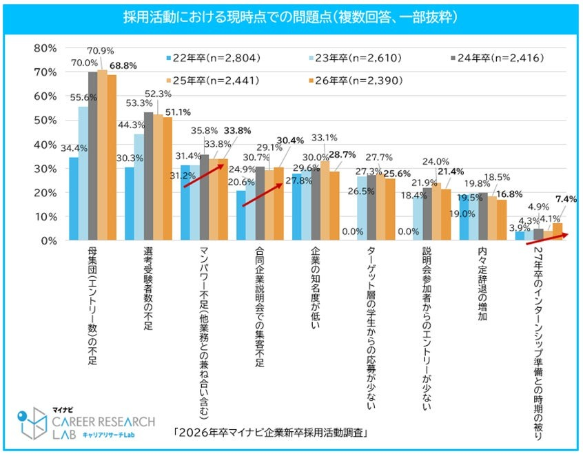採用活動における現時点での問題点については、前年トップの「母集団(エントリー数)の不足」が68.8%で、前年と比較すると微減となったものの今年も最多となっている。一方で年々、増加傾向にあるのが「マンパワー不足(他業務との兼ね合い含む)」が33.8%、「合同企業説明会での集客不足(30.4%)」「27年卒のインターンシップ準備への悪影響(時期の被り)(7.4%)」などだ。