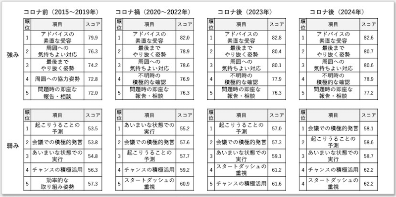 「上司から見た若手社員」の実態を可視化するために行われた本調査。上司の立場から見た若手社員の傾向をコロナ前(2015~2019年)、コロナ禍(2020~2022年)、2023年、2024年の4群に分類し分析している。まず、若手の強みとして挙げられたのは「アドバイスの素直な受容」「周囲への気持ちよい対応」「最後までやり抜く姿勢」「問題時の即座な報告・相談」などの項目。コロナ禍の前後で変わらず表出していることが明らかになった。コロナ禍以降においては、順位も同じ傾向にあるという。
