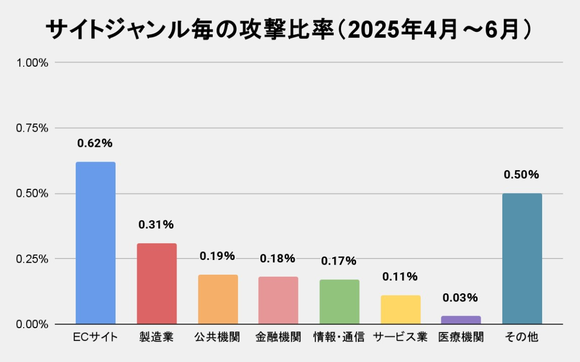 今回のレポートから新たに加わった「サイトジャンル」ごとの統計では、検出数、攻撃比率とも、トップはECサイトであったことも判明。2位の製造業と比較しても、その差は約2倍と突出して高い状況にあるようだ。