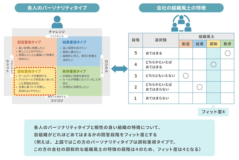 本調査では、年収への満足度に関係するもうひとつの重要な要素として「組織風土との相性(組織フィット)」があると解説されている。ここでいう組織フィット度とは、個人のパーソナリティタイプと職場の風土や価値観の一致度合いを指すという。