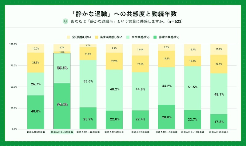 本調査では「静かな退職」という考え方に対し「非常に共感する(26.2%)」「やや共感する(46.5%)」と回答した人が全体の72.7%にも上った。多くの人がこの価値観に理解を示していることが明らかになった。特に、新卒入社後3~5年未満の勤続層では、89.5%が「共感する」と回答。若手社員の間で、特にこの傾向が顕著であることが判明した。