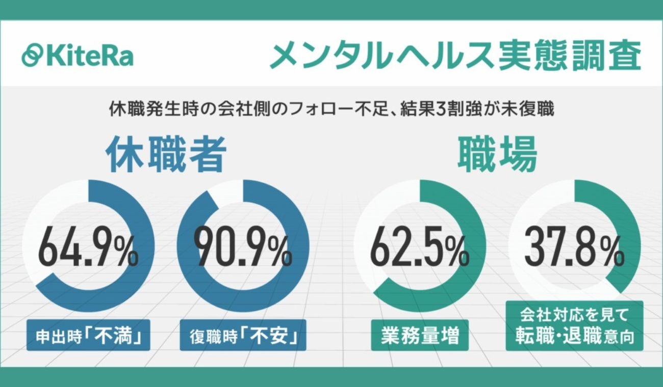 株式会社KiteRa(代表取締役 執行役員 CEO:植松隆史)は、全国のビジネスパーソンを対象とした「メンタルヘルスに関する実態調査」を実施。当事者(休職経験者)と職場(休職者がいた職場の正社員)の二軸で構成し、休職の申し出・引き継ぎ・復職といった各局面を横断して実態を明らかにした。