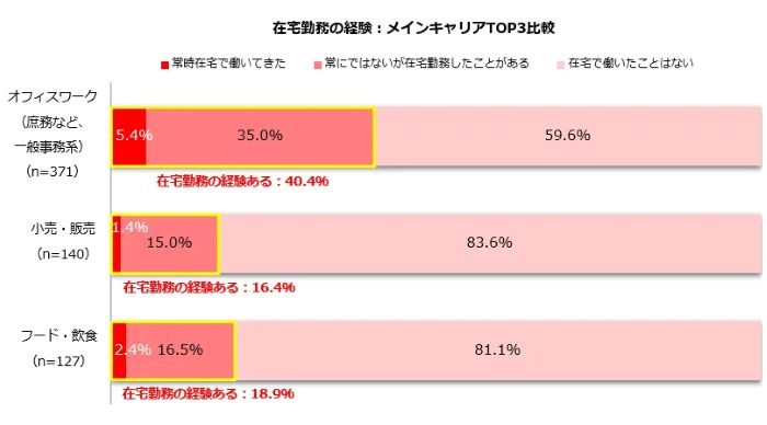 また、これまでの仕事経験でメインとなるキャリアの職種カテゴリーとして多かった上位3つ「オフィスワーク」「小売・販売」「フード・飲食」で在宅勤務の経験者比率を比較。