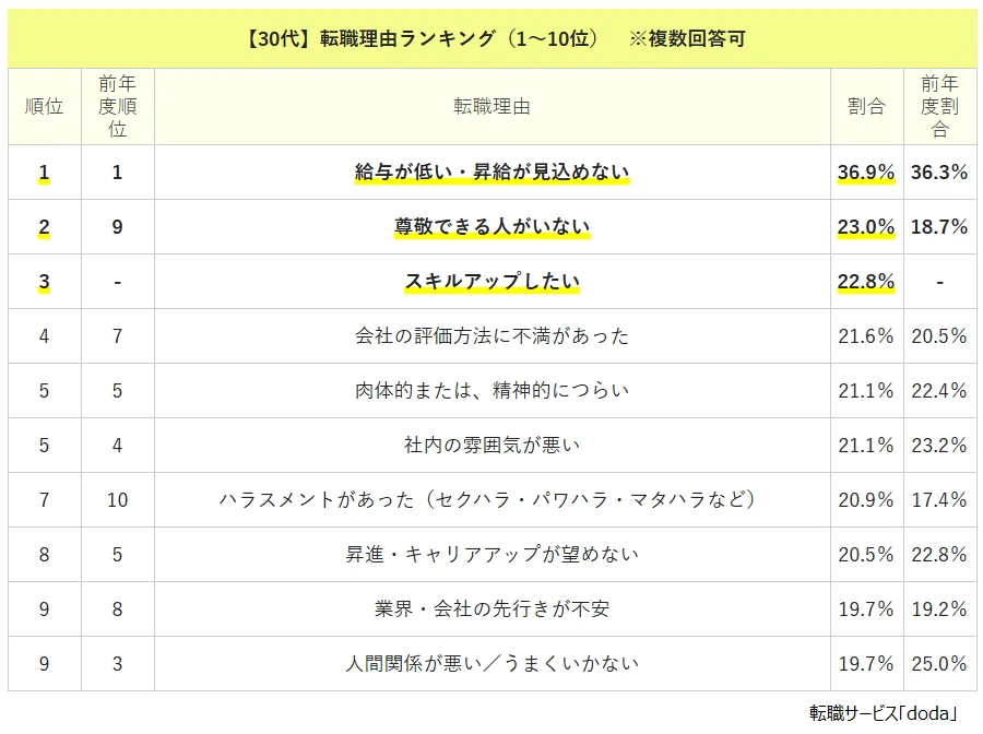 パーソルキャリア株式会社が運営する転職サービス「doda(デューダ)」(編集長:桜井貴史)は、2024年7月~2025年6月の1年間に転職した人のデータを元に、転職理由について調査を実施した。