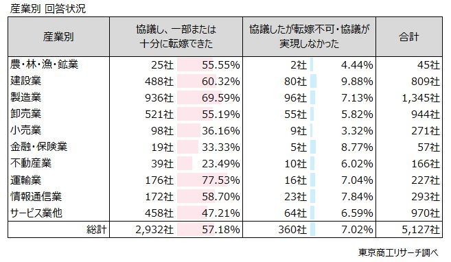 産業別の回答によると「価格転嫁」が「一部、または十分に転嫁できた」が、特に高い割合を示したのは「運輸業:77.5%」「製造業:69.5%」などだった。