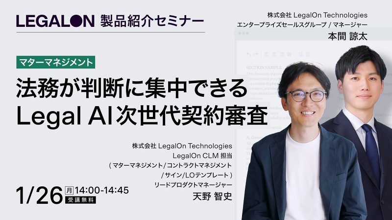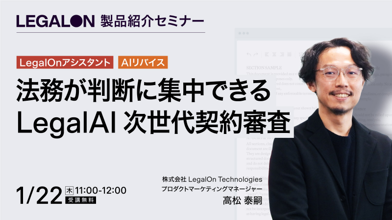 - 以下の事項につきあらかじめご了承のうえお申込みください。 株式会社LegalOn Technologies(以下「当社」という)と同業他社に所属される方や法律事務所に所属される方のご参加はご遠慮いただいております。 講義の内容は講師に一任をしており、当社は監修等を行っておりません。 講義内容へのご質問は、セミナーお申込み時点のみ受け付けいたします。セミナー終了後にいただいたご質問へはお答えできません。また、セミナーお申込み時点にいただいたご質問であっても、全てのご質問にお答えすることをお約束するものではありません。 お申込み情報に不備がある場合、参加をお断りさせていただく場合がございます。各項目を正しくご入力の上、お申込みくださいますようお願いいたします。 本セミナーに関し、予告なくセミナータイトル等を変更させていただく場合がございます。 定員に限りがございます。お早めにお申し込みください。定員に達し次第、受付を締め切らせていただきます。
