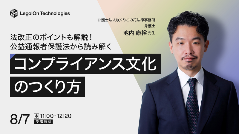 - 以下の事項につきあらかじめご了承のうえお申込みください。 株式会社LegalOn Technologies(以下「当社」という)と同業他社に所属される方のご参加はご遠慮いただいております。 講義の内容は講師に一任をしており、当社は監修等を行っておりません。 講義内容へのご質問は、セミナーお申込み時点のみ受け付けいたします。セミナー終了後にいただいたご質問へはお答えできません。また、セミナーお申込み時点にいただいたご質問であっても、全てのご質問にお答えすることをお約束するものではありません。 お申込み情報に不備がある場合、参加をお断りさせていただく場合がございます。各項目を正しくご入力の上、お申込みくださいますようお願いいたします。 本セミナーに関し、予告なくセミナータイトル等を変更させていただく場合がございます。 定員に限りがございます。お早めにお申し込みください。定員に達し次第、受付を締め切らせていただきます。