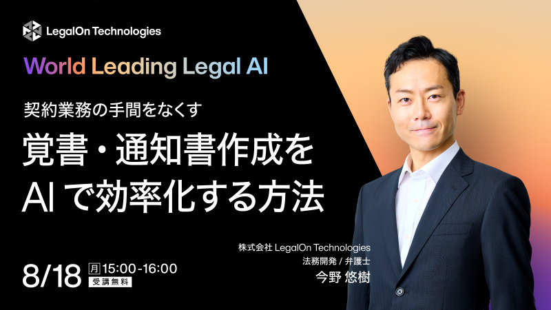 - 以下の事項につきあらかじめご了承のうえお申込みください。 株式会社LegalOn Technologies(以下「当社」という)と同業他社に所属される方のご参加はご遠慮いただいております。 講義内容へのご質問は、事前および当日にも受け付けいたします。セミナー終了後にいただいたご質問へはお答えできません。また、セミナーお申込み時点にいただいたご質問であっても、全てのご質問にお答えすることをお約束するものではありません。 お申込み情報に不備がある場合、参加をお断りさせていただく場合がございます。各項目を正しくご入力の上、お申込みくださいますようお願いいたします。 本セミナーに関し、予告なくセミナータイトル等を変更させていただく場合がございます。